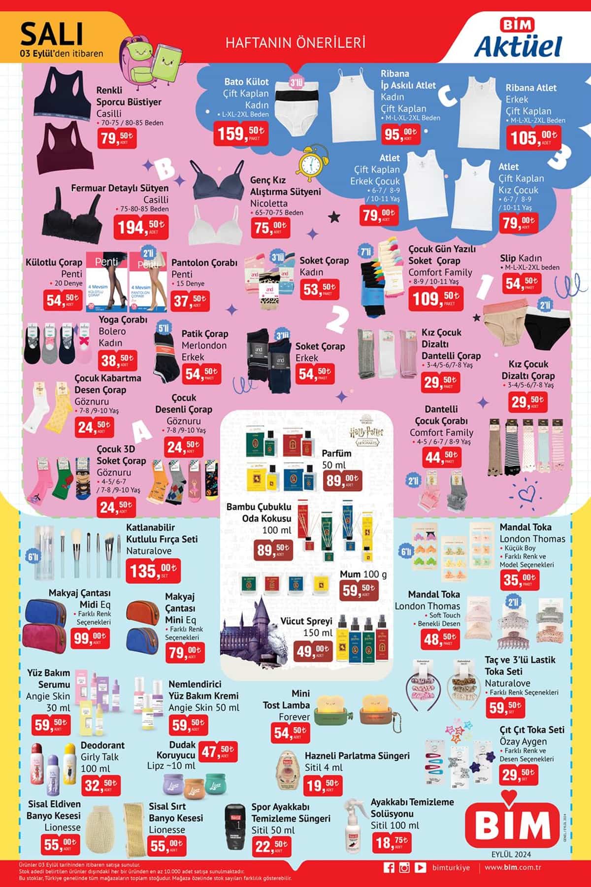 Bim 3 Eylül 2024 Salı tarihli kataloğunun sayfa detaylarında yer almış kampanyalı ürünlerinin nelerden oluştuğunu incelemesine başladığımızda klasik Haftanın Önerileri etiketi ile Temel ihtiyaçlarınız için ürün gruplarında; Kişisel Bakım, Bebek Bezleri, Güneş Kremleri, Süt ve Süt Ürünleri, Et ve Et Ürünleri, Soslar, Makarnalar, Bakliyatlar, söyleyebiliriz. Bu Salı Bim’de indirimde neler var? sorusunun merak edilen cevaplarının yer aldığı Yeni Bim aktüel ürünler kataloğunun 3 Eylül 2024 kampanya listesinde ilk sayfasında yer alan kampanya ürünleri sırasıyla şöyle; Kadın Slip 54,50 TL. Parfüm 50 ml 89 TL. Mum 100 gr 59,50 TL. Vücut Spreyi 150 ml 49 TL. Penti Külotlu Çorap 54,50 TL. Eq Makyaj Çantası Midi 99 TL. Eq Makyaj Çantası Mini 79 TL. Erkek Soket Çorap 3’lü 54,50 TL. Kadın Soket Çorap 3’lü 53,50 TL. Kız Çocuk Dizaltı Çorap 29,50 TL. Çift Kaplan Kız Çocuk Atlet 79 TL. Bim Katalog Bu Hafta indirim listesinde yer bulan ve Bu Salı Bim Market reyonlarında 10 Eylül 2024 tarihine kadar büyük indirimler ile satışa sunulacak olan 03 Eylül 2024 Bim aktüel kataloğunun ürün fırsatları devamında; Forever Mini Tost Lamba 54,50 TL. Penti Pantolon Çorabı 2’li 37,50 TL. Bolero Kadın Yoga Çorabı 38,50 TL. Çift Kaplan Erkek Çocuk Atlet 79 TL. Lipz Dudak Koruyucu 10 ml 47,50 TL. Özay Aygen Çıt Çıt Toka Seti 29,50 TL. Girly Talk Deodorant 100 ml 32,50 TL. Çift Kaplan Erkek Ribana Atlet 105 TL. Lionesse Sisal Sırt Banyo Kesesi 55 TL. Çift Kaplan Kadın Bato Külot 159,50 TL. Casilli Renkli Sporcu Büstiyer 79,50 TL. Göznuru Çocuk Desenli Çorap 24,50 TL. Bim Salı Kataloğu 3 Eylül 2024 kampanyalarında ki seçili diğer ürünleri ise; London Thomas Mandal Toka 6’lı 35 TL. Casilli Fermuar Detaylı Sütyen 194,50 TL. Göznuru Çocuk 3D Soket Çorap 24,50 TL. Kız Çocuk Dizaltı Dantelli Çorap 29,50 TL. Merlondon Erkek Patik Çorap 5’li 54,50 TL. Nicoletta Genç Kız Alıştırma Sütyeni 75 TL. Lionesse Sisal Eldiven Banyo Kesesi 55 TL. Sitil Hazneli Parlatma Süngeri 4 ml 19,50 TL. Çift Kaplan Kadın Ribana İp Askılı Atlet 95 TL. Bambu Çubuklu Oda Kokusu 100 ml 89,50 TL. Angie Skin Yüz Bakım Serumu 30 ml 59,50 TL. Naturalove Taç ve 3’lü Lastik Toka Seti 59,50 TL. Göznuru Çocuk Kabartma Desen Çorap 24,50 TL.