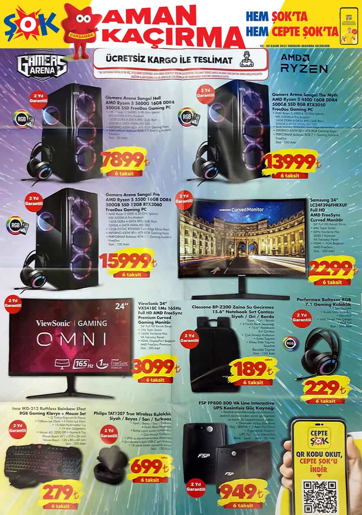 Şok 2 Kasım 2022 aktüel kataloğunun fırsat ürünleri ile takipçi müşterilerinin dönemsel talep ve beklentilerine cevap verecek olan Şok Market Aman Kaçırma etiketi ile muhteşem dolu dolu hazırldığı Yeni Şok Aktüel Kataloğu ile harika bir kampanyaya daha imza atıyor. Şok’ta bu hafta indirimde neler var? sorusunun günlerdir merak edilen tüm cevaplarının yer aldığı 2 Kasım 2022 Şok Kataloğu ürün gruplarında bu hafta Teknoloji ve elektronik ürünler, Elektrikli mutfak ürünleri, Harika tasarımlara sahip Ev Eşyaları, Züccaciye ve Mutfak ürünleri ile temel ihtiyaç grubunda çok çeşitli ürünler büyük indirimler ile listede ki yerlerini almış durumda. İşte; Şok Market mağazalarında ve Cepte Şok’ta 09 Kasım 2022 Çarşamba gününe kadar geçerli Şok 2 Kasım 2022 aktüel ürünler kataloğunun ilk sayfasında Ücretsiz Kargo ile teslimat seçeneği ile Teknoloji grubunda kredi kartına peşin fiyatına 6 taksit avantajı ile sınırlı sayıda satışa sunulacak; 2 yıl garantili olarak alabileceğiniz 16 GB DDR4 Ram ve 520 GB SSD diskli FreeDos işletim sistemli Gamers Arena Sangal Hell AMD Ryzen Gaming PC 7899 TL. 16 GB DDR4 Ram ve 520 GB SSD diskli FreeDos işletim sistemli Gamers Arena Sangal The Myth AMD Ryzen Gaming PC 13999 TL. 16 GB DDR4 Ram ve 520 GB SSD diskli FreeDos işletim sistemli Gamers Arena Sangal Pro AMD Ryzen Gaming PC 15999 TL. Hem Şok’ta Hemde Cepte Şok’ta geçerli olacak 2 Kasım Şok aktüel kataloğunda teknoloji ve elektronik Ürünler grubunda kredi kartına peşin fiyatına 6 taksit avantajı ile alabileceğiniz fırsat ürünleri; 2 yıl garantili Samsung 24″ Full HD AMD Freesync Curved Monitör 2299 TL. 2 yıl garantili VievSonic 24″ Full HD FreeSync Premium Curved Gaming Monitör 3099 TL. Performax Baltazar RGB Gaming Kulaklık 229 TL. Inca RGB Gaming Klavye+Mouse Set 279 TL. Phılıps True Wireles Kulaklık 699 TL. FSP Line İnteractive UPS Kesintisiz Güç Kaynağı 949 TL. Classone Zaino Su Geçirmez Notebook Sır Çantası 189 TL.